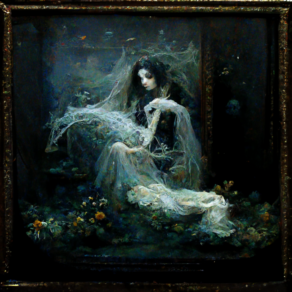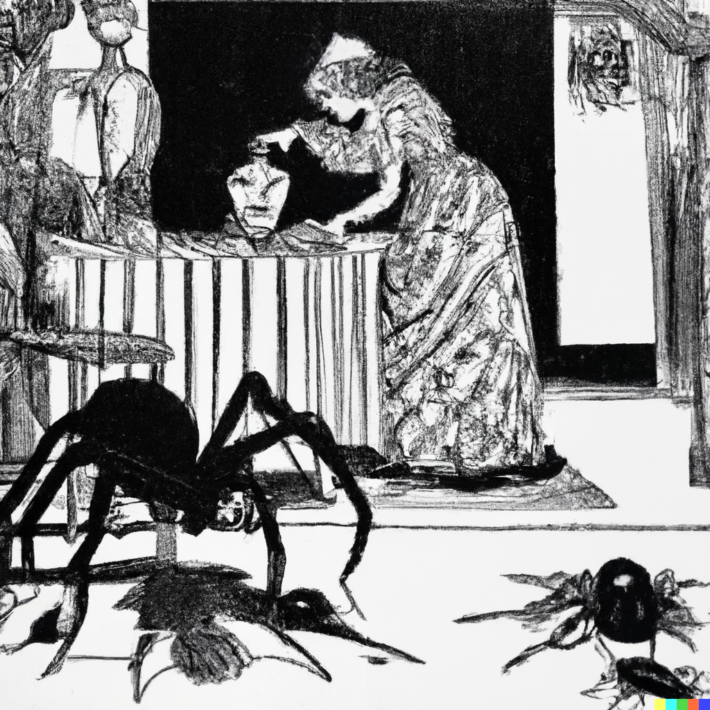 Cauldron alchemy of sizzling wormwood heart-sparks glowing like sixth magnitude stars which is to say not bright at all salt sulfur mercury the yin yang and beyond blood drawn from meaty bottom lip the missing ingredient Grandma Spider instructs I fill a bowl with boiled goat milk and drop three of her raisin-black grandchildren into the viscous liquid. The spiders gurgle as Grandma watches from her webbed throne. Now, she says. With scalded fingertips I fish them out. They walk across my workbench, arachnid-bent legs weeping white across the swirling woodgrain spinnerets spitting brittle silk soaked in milk. The spiders crumble and die and I cry, I cry but Grandma Spider shouts, The spell, girl. Focus on the spell. Soon enough, the drenched threads weave a shape on the table, the lost last ingredient. Grandma Spider nods, perched high in all her ancient glory. I gather the gossamer flower embroidery onto my palm swallowing it down whole.